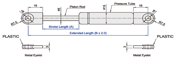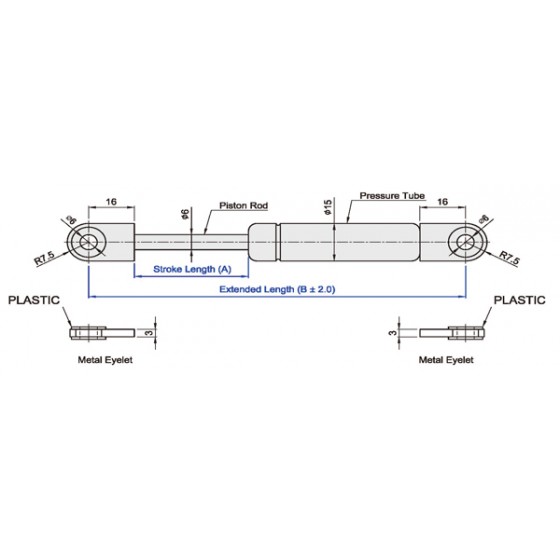 | Model No. | Stroke Length (A) | Extended Length (B) | Force Rang (N) |