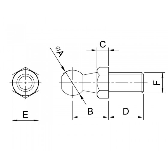 | 型號 | 球頭直徑 ( A ) | B | C | D | E | 螺牙規格 ( F ) | 材質 | 表面處理 | 產品淨重 (g) |
