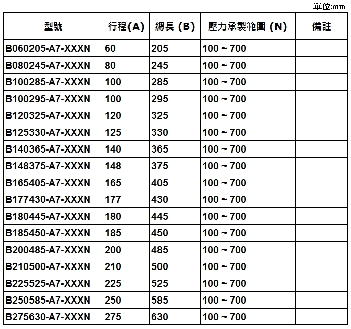 2. SUPERSEN 自由型氣壓棒(氮氣缸) 規格品其軸心表面處理:氮化軸心/ 外管表面處理: 黑色烤漆 (其它顏色需求亦可製作)