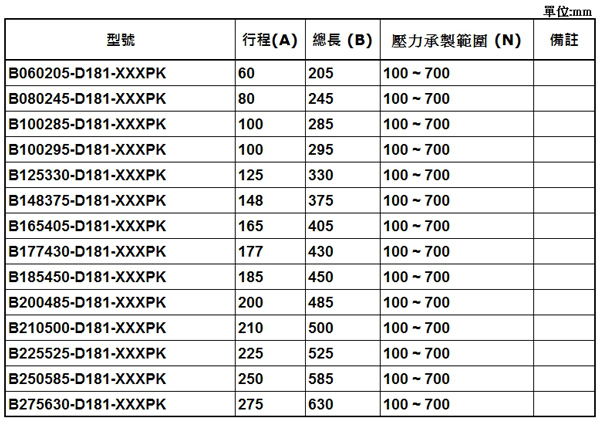2.請客戶於詢價時,告知氮氣缸所需之壓力F1(N) , (9.8 牛頓(N)=1公斤(KG)=2.2磅(LBS)  /  長度單位(mm)