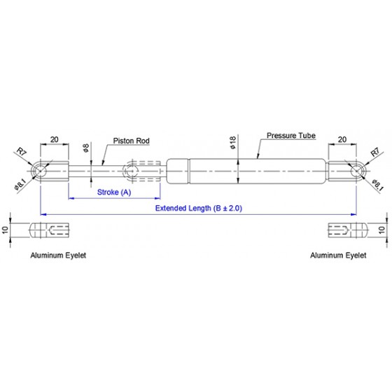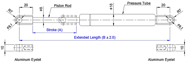 1. 自由型全行程等速氣壓棒 0818 系列係指軸心直徑為8 mm, 外管直徑為18 mm的氮氣缸,其壓力介質為氮氣(N2), 阻尼介質為液壓油(OIL),適用溫度為 - 20℃~+80℃,允許長度公差範圍為±2mm。