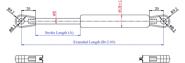 4. 請客戶於詢價時,告知氮氣缸所需之壓力F1(N) , (9.8 牛頓(N)=1公斤(KG)=2.2磅(LBS) / 長度單位(mm)