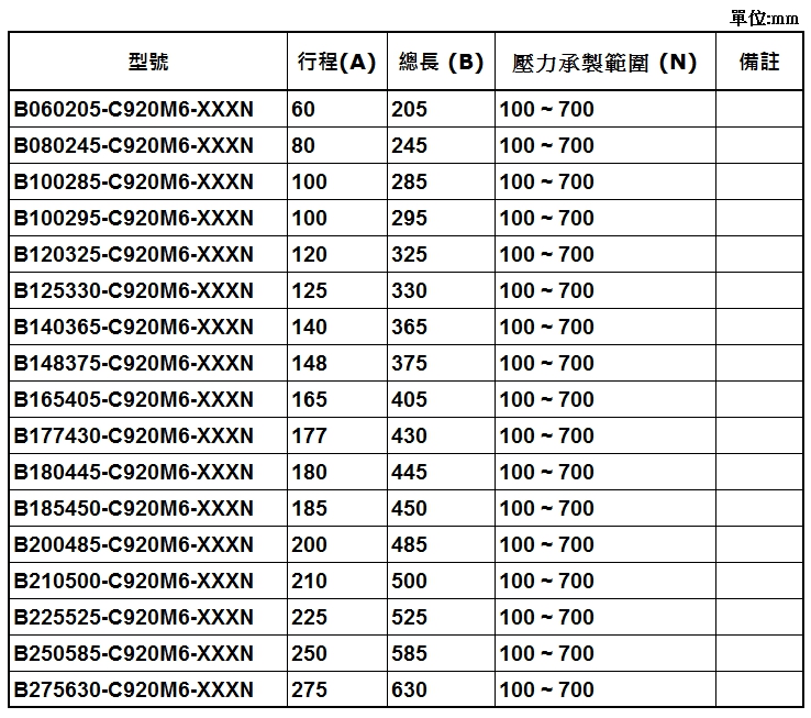 2. SUPERSEN 自由型氣壓棒(氮氣缸) 規格品其軸心表面處理:氮化軸心/ 外管表面處理: 黑色烤漆 (其它顏色需求亦可製作)