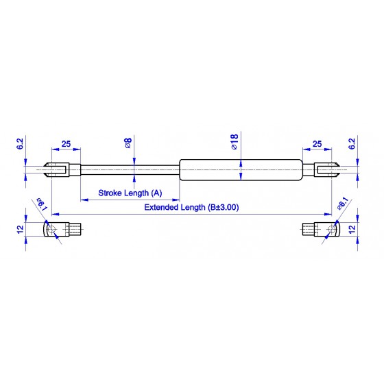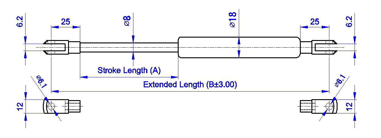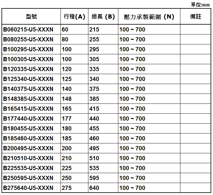 1. SUPERSEN 自由型氮氣缸氣壓棒 0818 系列係指軸心直徑為8mm, 外管直徑為18mm 的氮氣缸,其壓力介質為氮氣(N2), 阻 尼介質為液壓油(OIL),適 用溫度為 - 20℃~+80℃,允許長度公差範圍為±3mm。