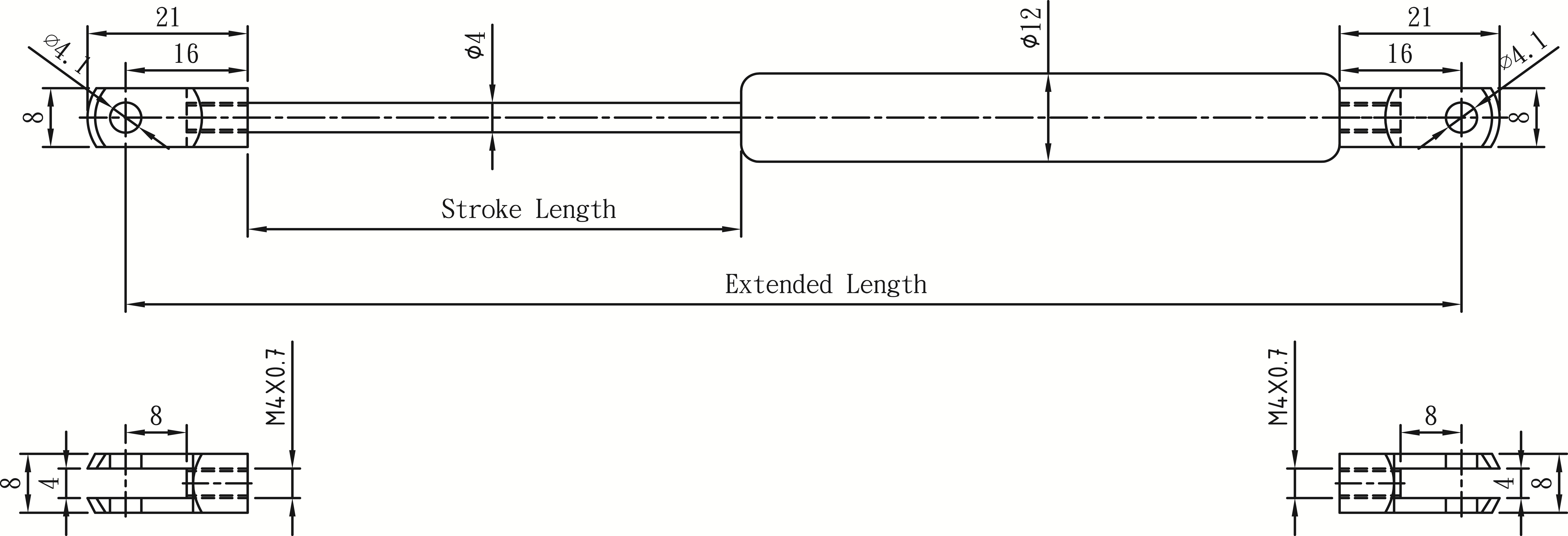 1. SUPERSEN 自由型氮氣缸氣壓棒 0412 系列係指軸心直徑為4mm, 外管直徑為12mm 的氮氣缸,其壓力介質為氮氣(N2), 阻 尼介質為液壓油(OIL),適 用溫度為 - 20℃~+80℃,允許長度公差範圍為±2mm。